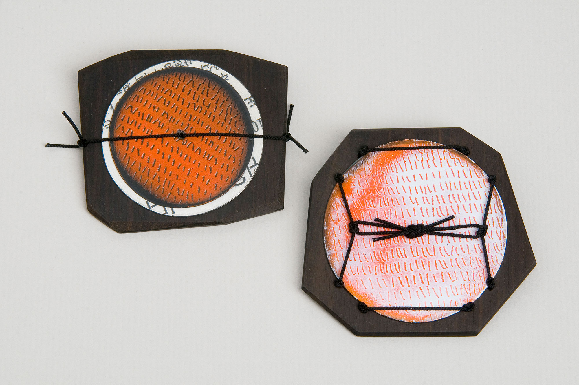 Composition with orange & white #1&2 2011 Brooches Steel, enamel, wood & Korean textile # 2010s ← Unsung Heroes Drawing, Permanence & Place →