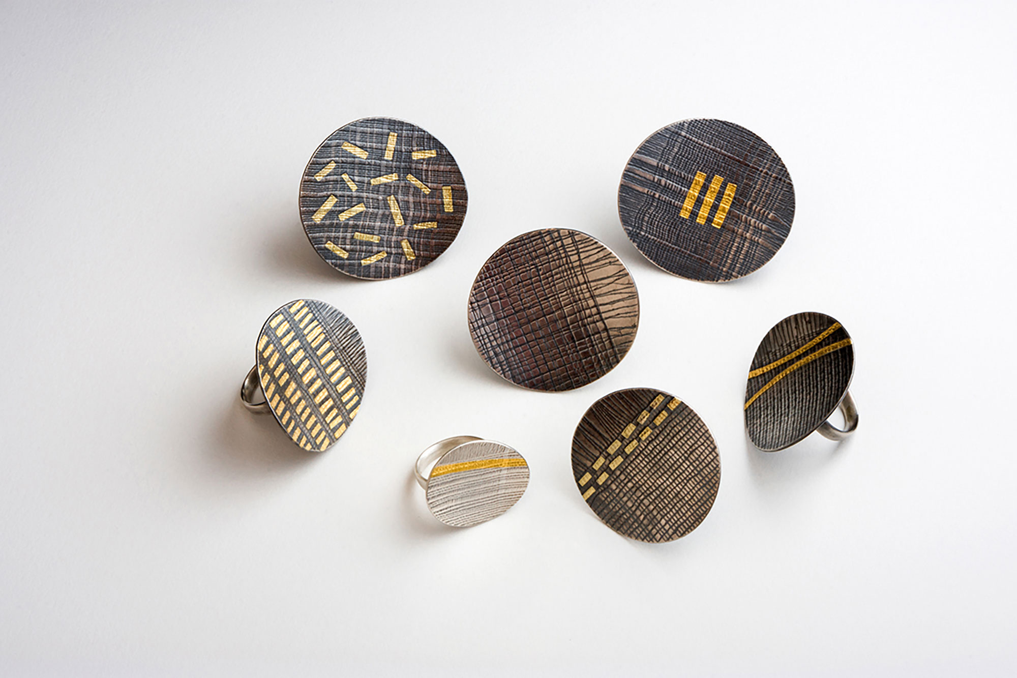 Linen print series 2013 Rings Oxidised silver, 22ct, 18ct gold 2.6 -4.4 cm dia. # 2010s ← Linen print series Linen Print series →