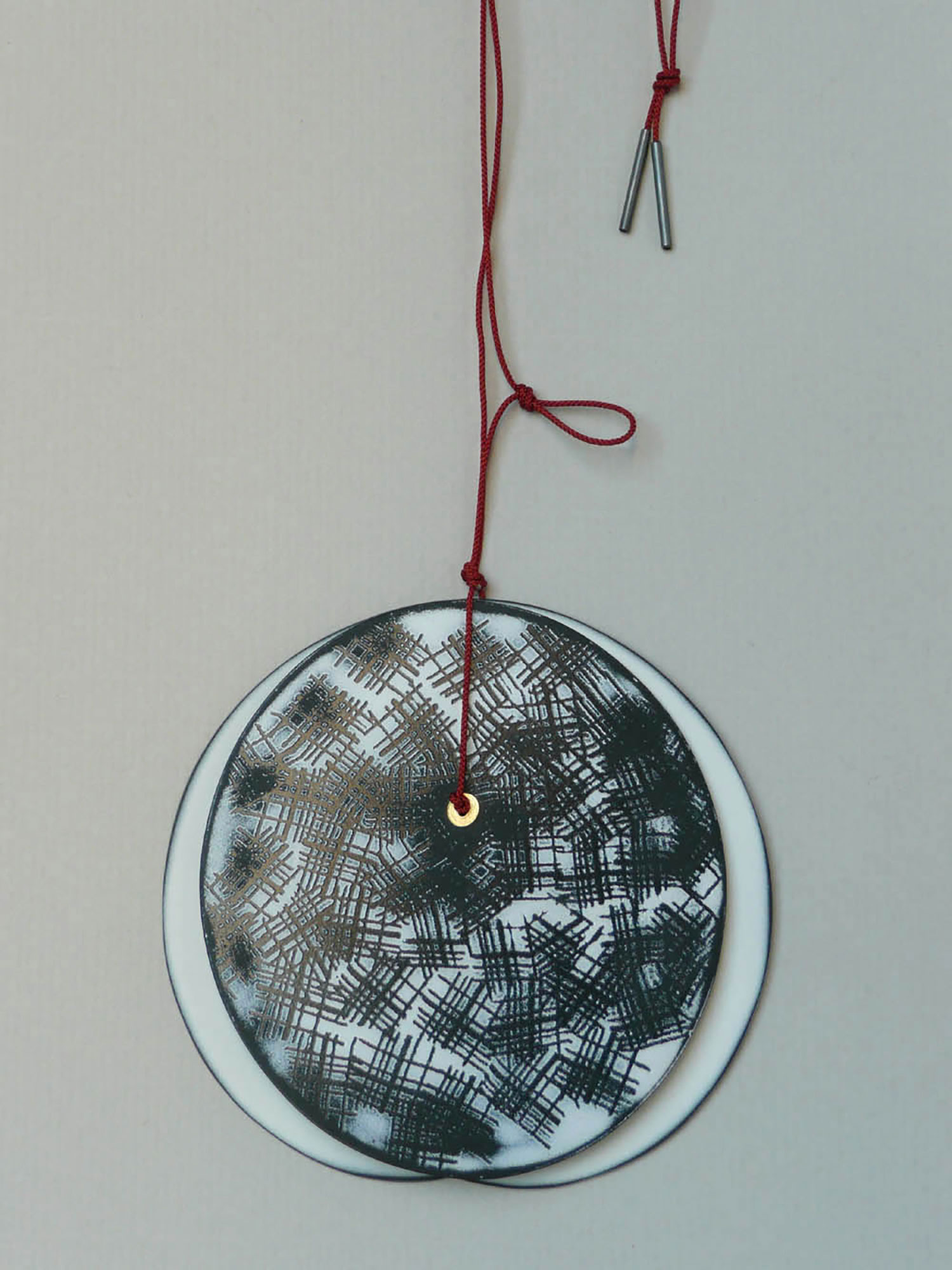 Loops & Lines 2012 Pendant Steel, enamel, oxidised silver, 18ct gold, Korean textile 57.5 cm L # 2010s ← Badges & Buttons - Waistcoats & Vests Brooches →