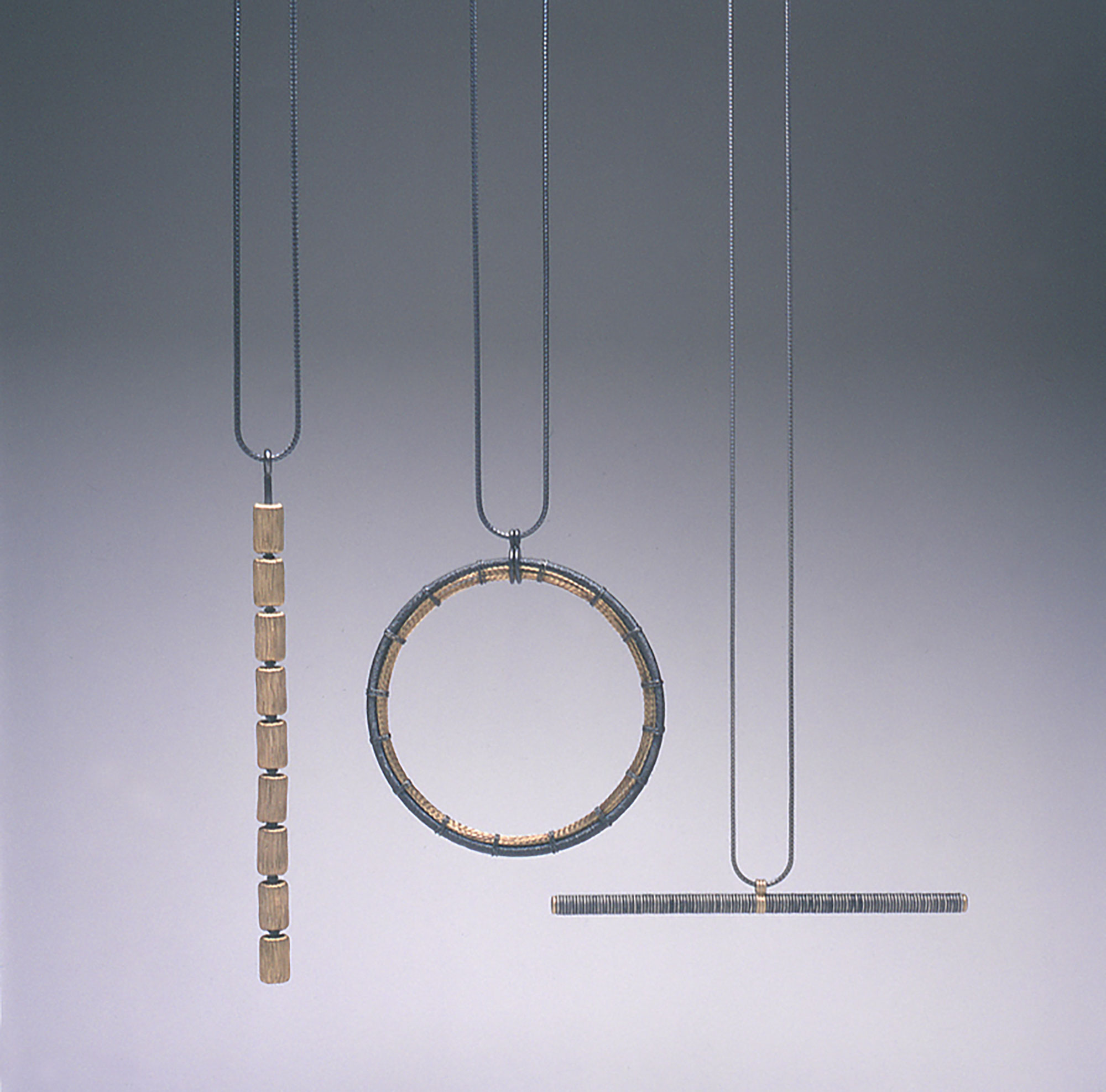 NECKPIECES 2001 L-R Flowing Movement # 11cm Moving from the Centre # 2 7.5 cm dia. Precision # 2 10 cm Oxidised silver, 18ct gold # 2000s ← Alhambra series, Brooches Flowing Movement #2 & 3 →