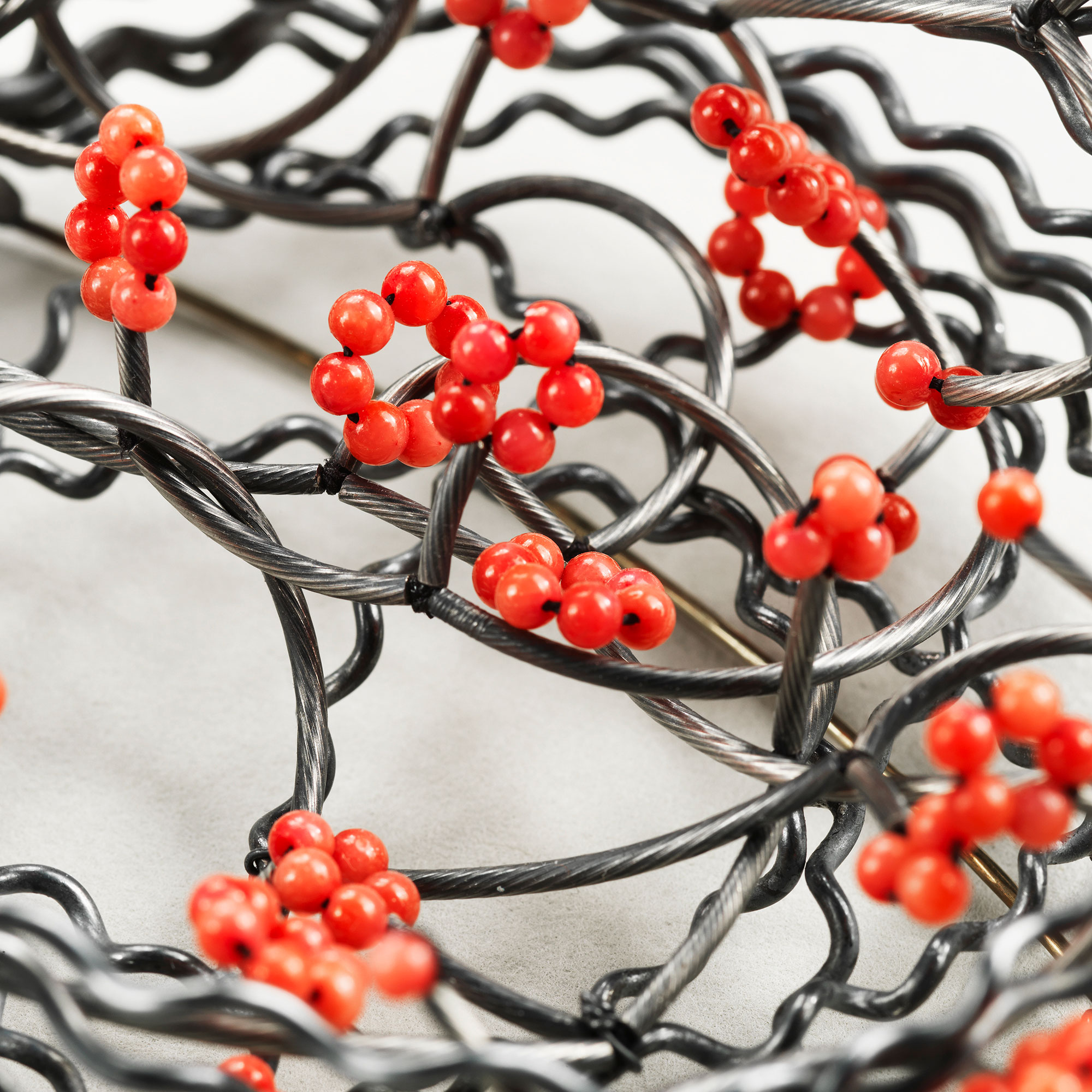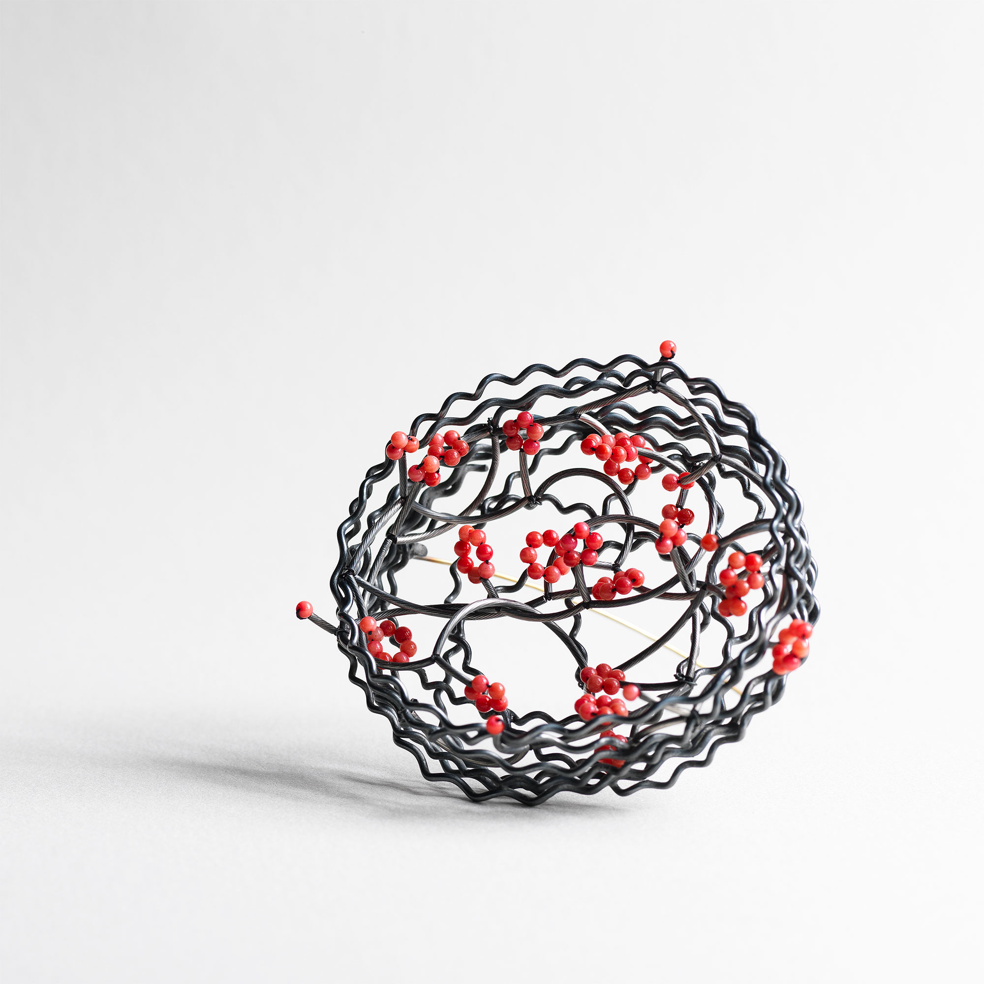Shima II, Brooch 2021 Oxidised silver, faux coral 7.5 cm x 6 cm # 2020s ← Shima III, Brooch Shima I, Brooch →