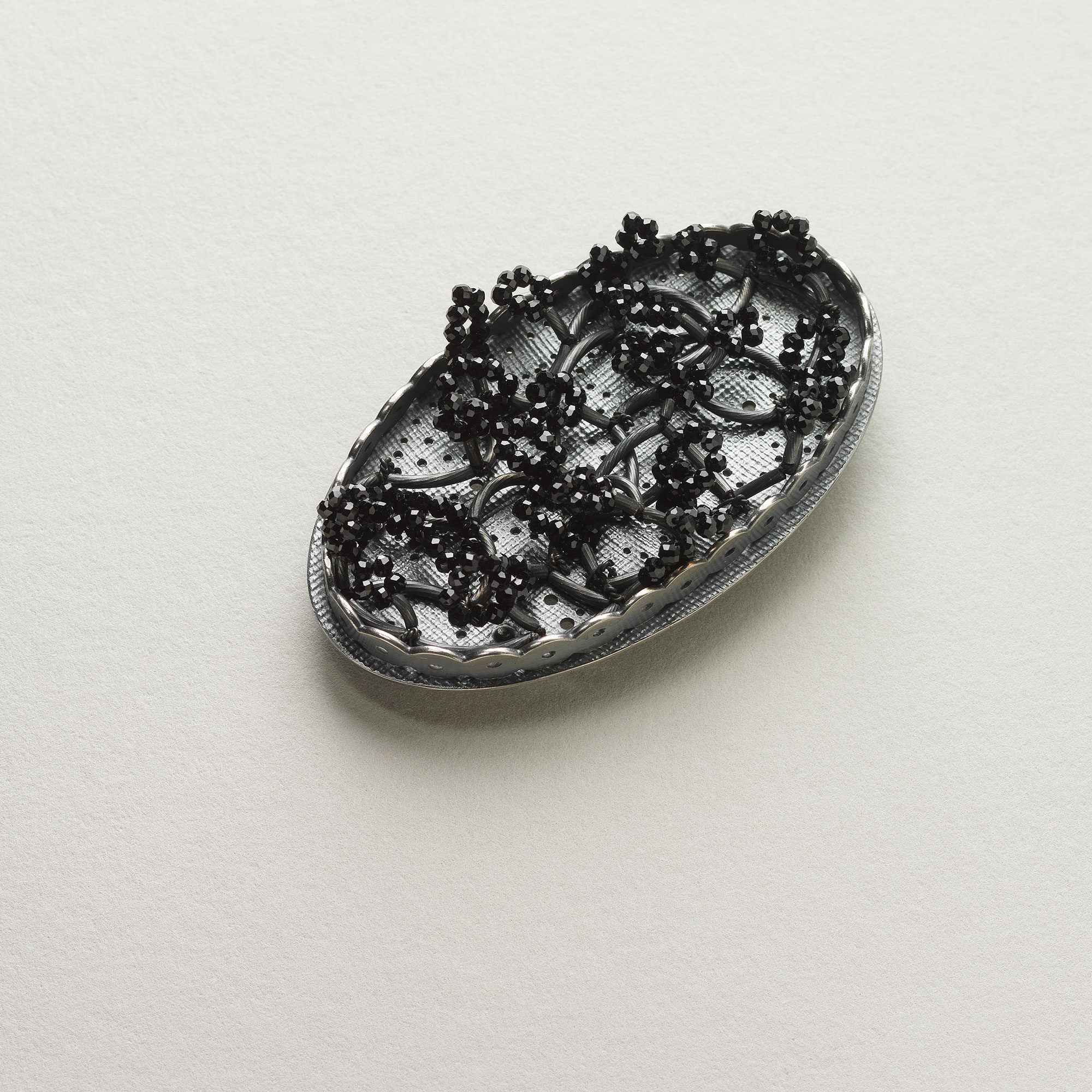 Shima III, Brooch 2021 Oxidised siIver, bIack spineI 6.4 x 3.8 cm CoIIection: Spencer Museum of Art, USA # 2020s ← Shima IV, Brooch Shima II, Brooch →