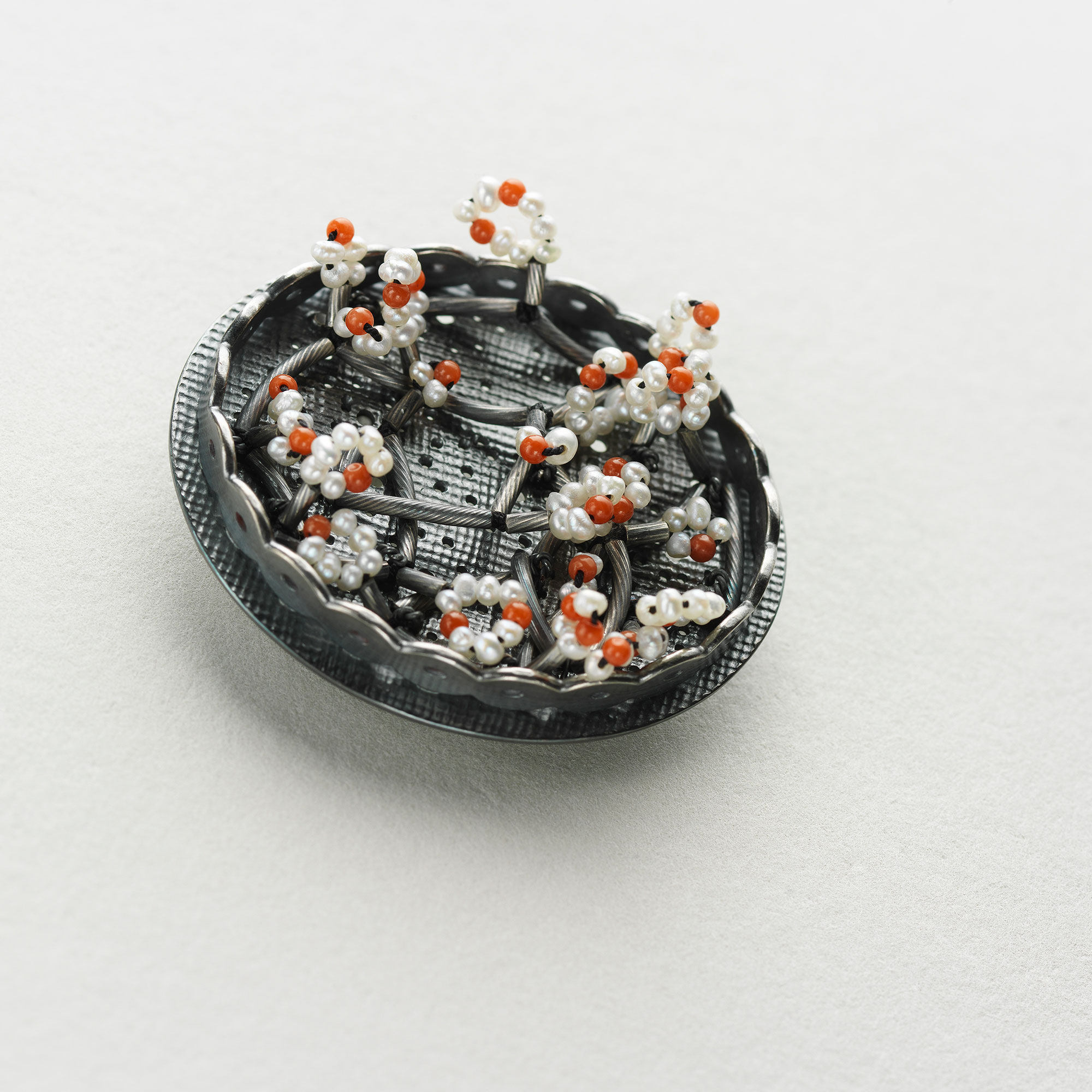 Shima IV, Brooch 2021 Oxidised silver, freshwater pearls & faux coral 4 x 3.7 cm # 2020s ← Shima V, Brooch Shima III, Brooch →