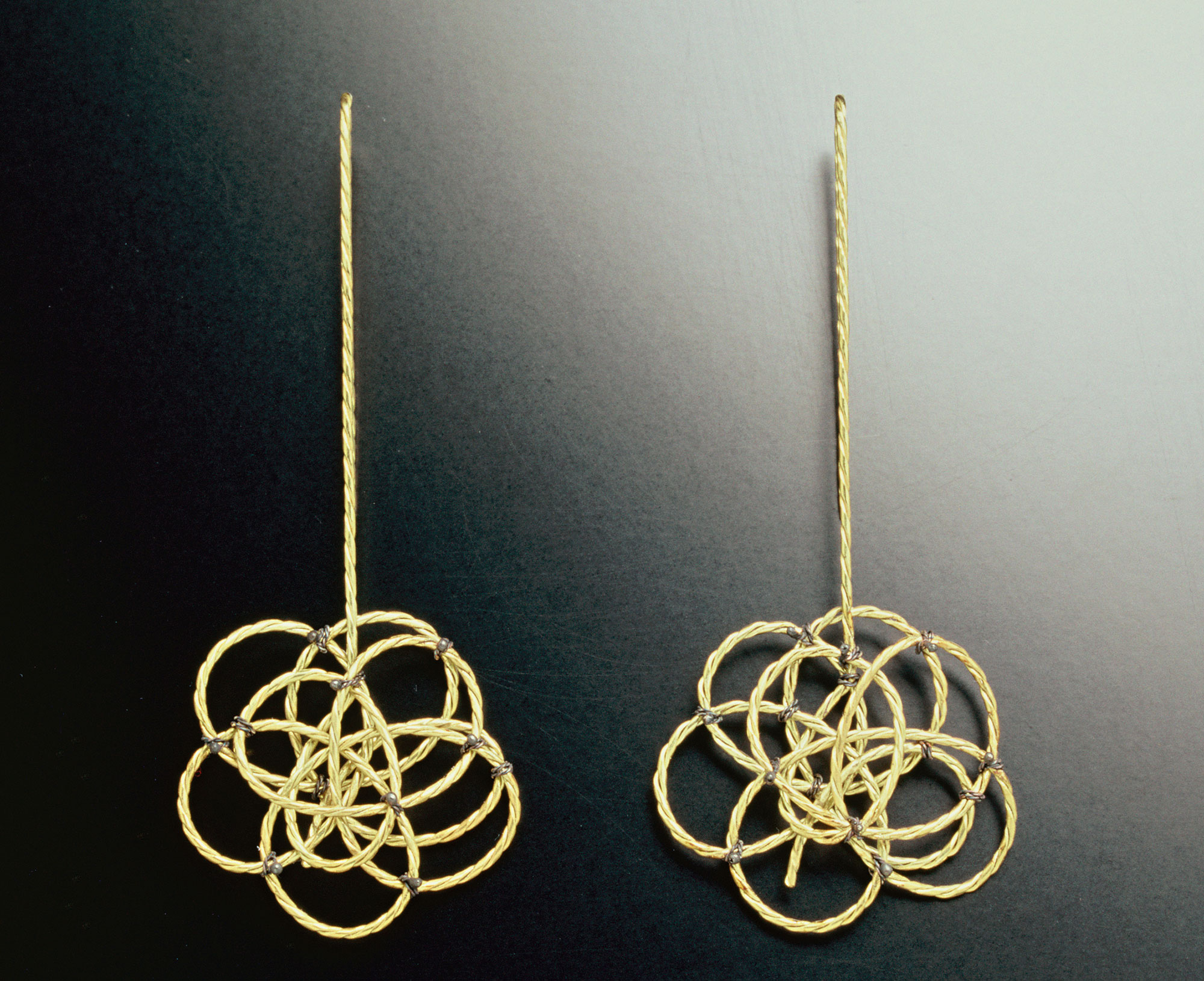 Tangle Earrings 2004 18ct gold, oxidised silver 7 cm L # 2000s ← Loop the Loop series Chroma Brooch →