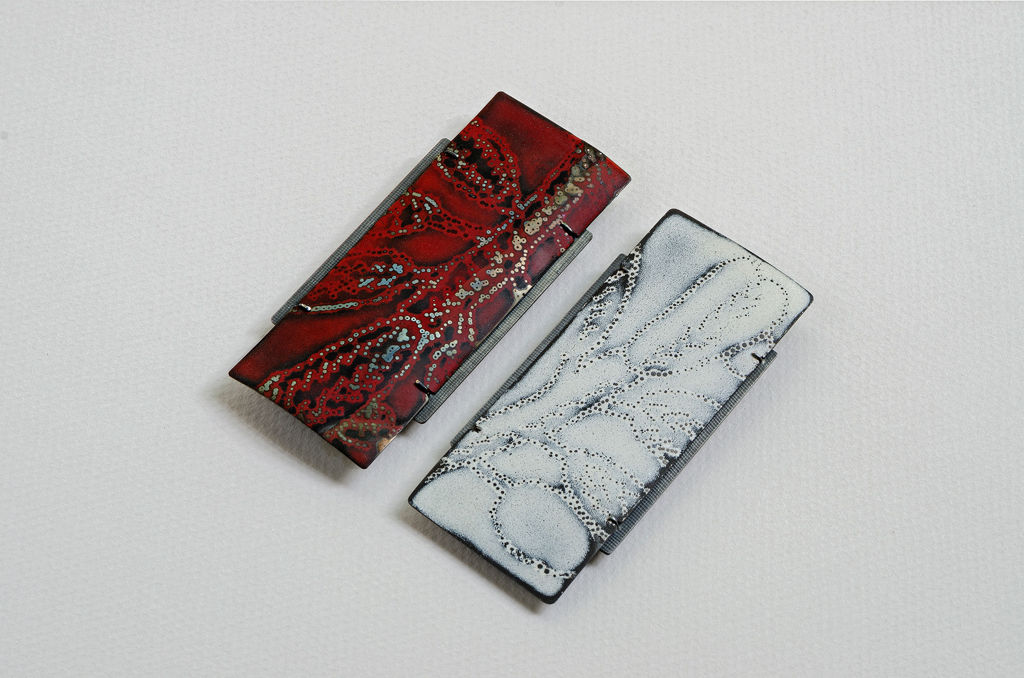 Thorn Berries I & II 2015BroochesEnamel, steel, oxidised silver10 x 4.4 cm Catalogue text # 2010s ← Earrings Wild Rose →